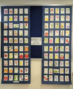 第28回お宮町秋まつりで展示した絵がみを楽しむ会(富谷市)の皆さんの絵手紙の作品を杜の都信用金庫 宮町支店のご厚意で