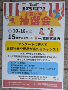 この後、宮町商店街振興組合の店舗で地域の皆様ねの感謝の意で協賛いただいた店舗からサービス券や協賛品などは、皆様から欲しいものに手を上げて頂きました。提供されたものより多数の手が上がった場合、ジャンケンで勝ち抜いた方に差し上げました。