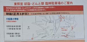 臨時駐車場として小松島小学校をご利用くださいとのこと。五城中学校や北六小学校は、利用できません。例年、多くの参拝があり大変、込み合うことが予想されています。近くにあるコインパーキング(有料) もしくは、公共交通機関をご利用くださいと書かれております。