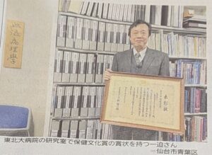 「血液アカデミー」保険文化賞を受賞(悪性リンパ腫の統合的な病理診断システムを確立し、宮城県を中心として症例登録と予後追跡からなる緻密な疫学調査の基盤を築き、悪性リンパ腫の診療レベル向上とともに血液内科医・病理医の人材育成に貢献している)されたと令和8年1月10日(土)の河北新報朝刊に大きく取り上げられていました。