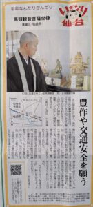 河北新報の夕刊2月3日(火)午年なんだりかんだりで仙岳院の馬頭観音座像のいわれの紹介と宮町商店街の理事長にも取材いただいたことを掲載いただきました。